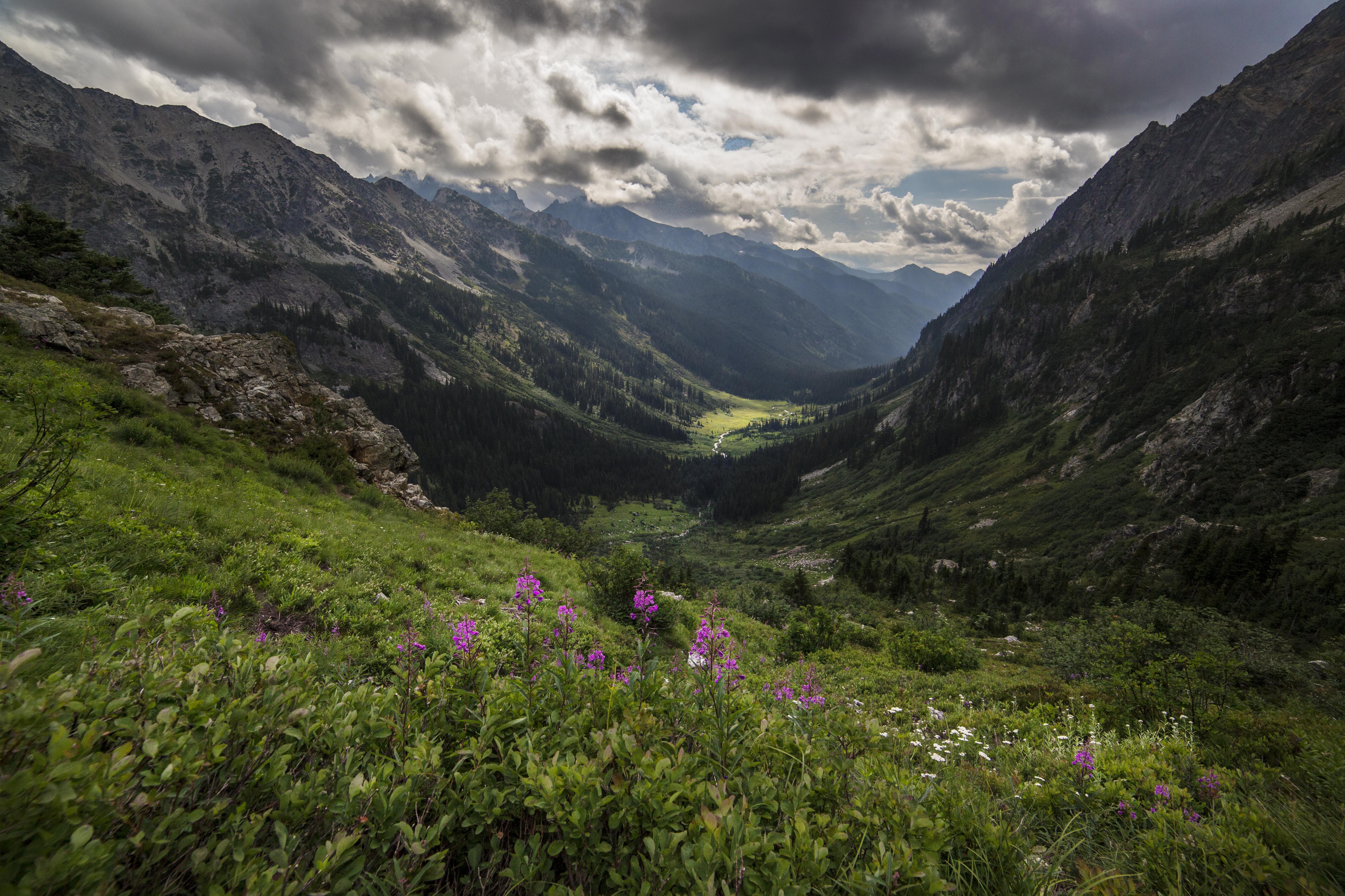 I love the way you got in the shot something a tiny as a flower, and something as huge as a mountain,along with the almost-stormy clouds. 5 stars out of 5!