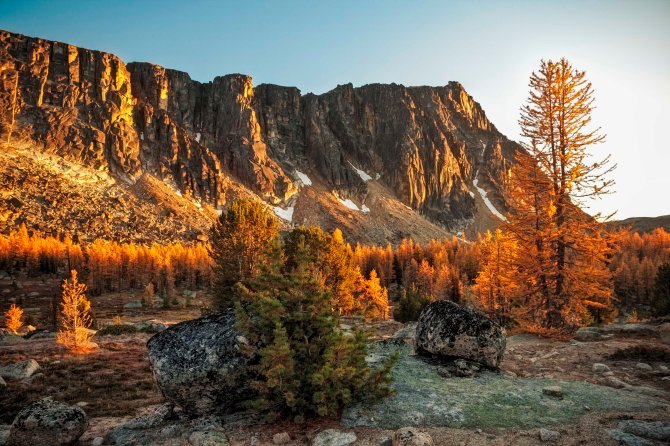 The North Cascades offer a unique version of fall, The Larch. The mountain larch, or Tamarack, looks like a regular evergreen in the spring or summer, but in early October the needles turn bright orange, and then fall off.