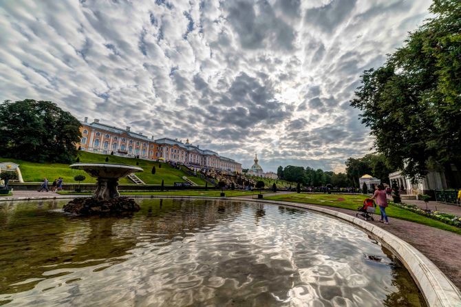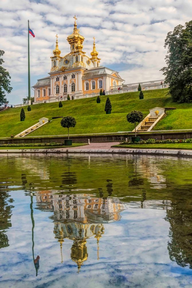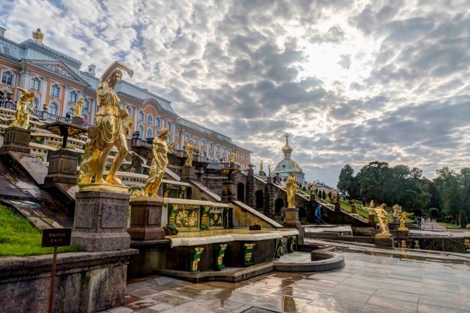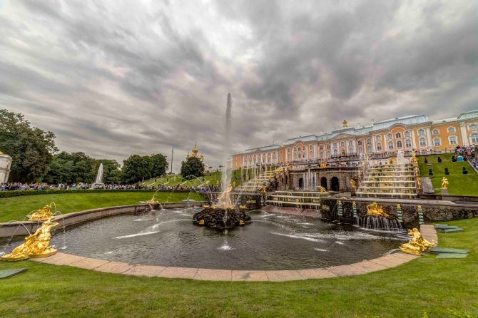 The Peterhof Palace (Russian: Петерго́ф, IPA: [pʲɪtʲɪrˈɡof],[1] German for Peter’s Court)[2] is a series of palaces and gardens located in Petergof, Saint Petersburg, Russia, laid out on the orders of Peter the Great. These palaces and gardens are sometimes referred as the “Russian Versailles“.