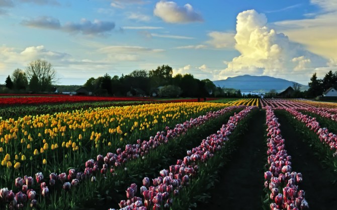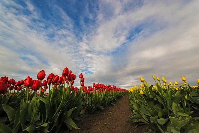 Broad swaths of brightly colored tulips spring up all over the flats.