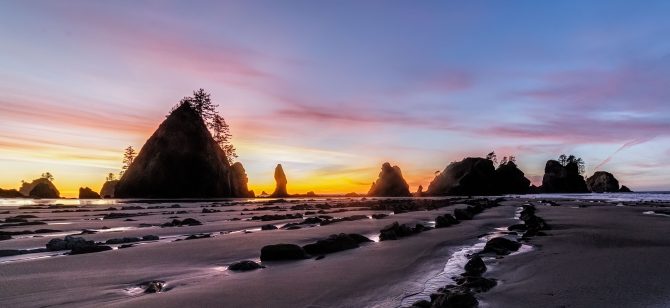 The spot I’ve visited most often is Point of the Arches. It lies along the northern-most section of ONP, just south of Neah Bay. Its now a very popular spot and sees many visitors. These images are from a trip 2 years ago, in January. A window of warm sunny weather was forecast, and I spent two glorious days there with sumptuous light. On this particular sunset the colors were so bright and vivid and the orange glow from the rocks and sand so intense, it was more tricky than one would think to edit these and do the place justice.