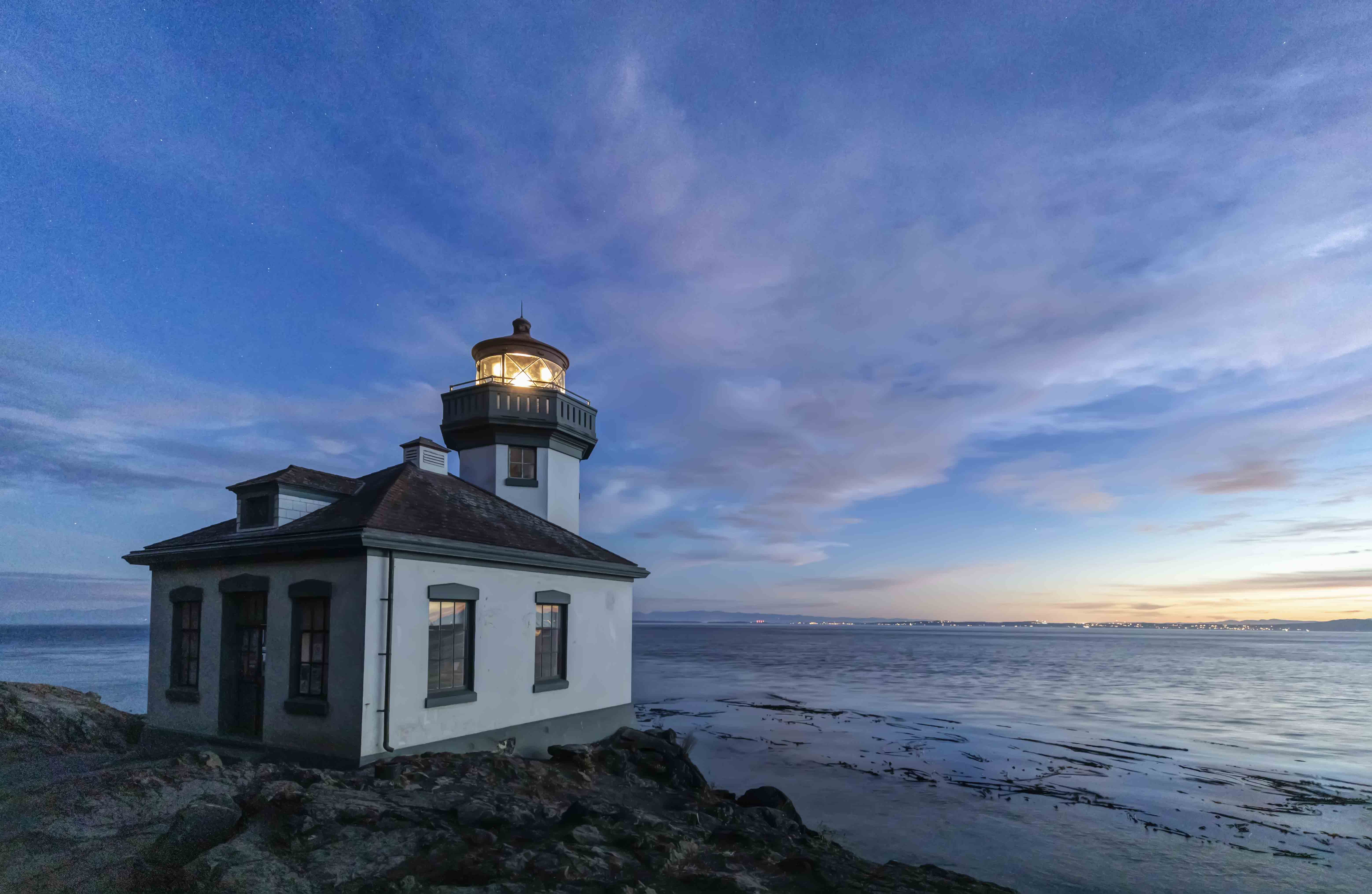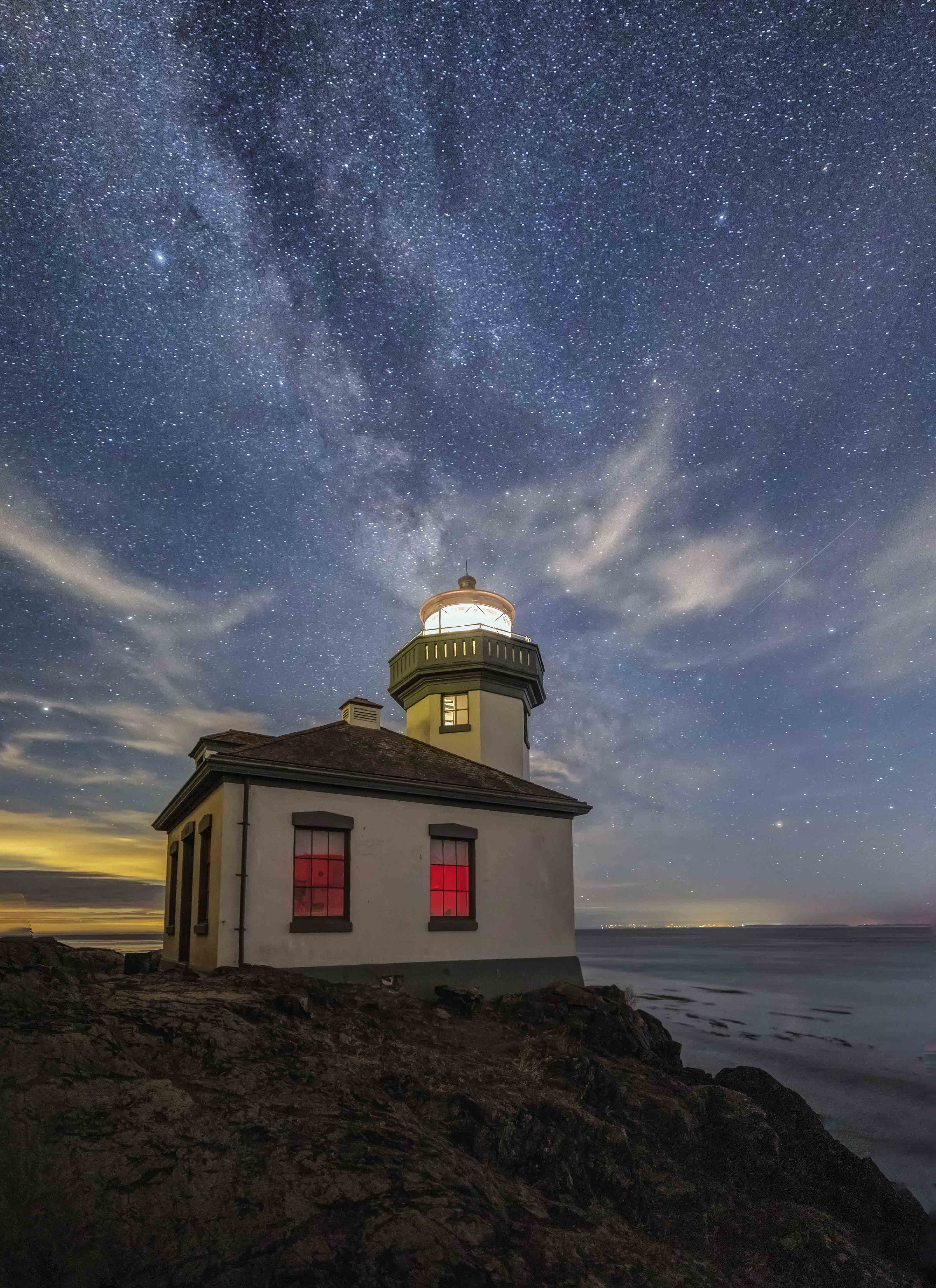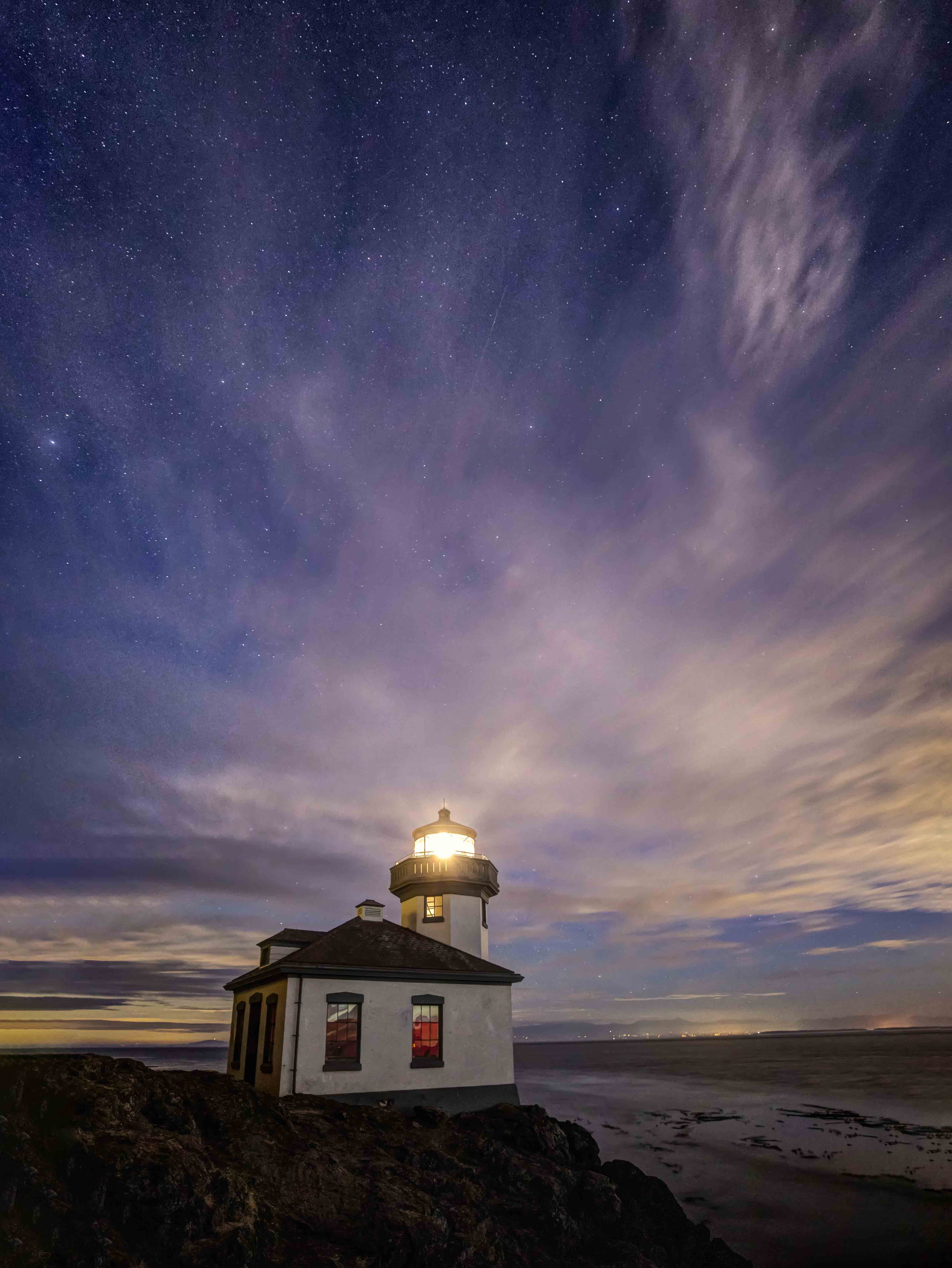 Lime Kiln Lighthouse is on the west side of the island and is famous for whale watching and sunsets. The lighthouse is surrounded by people watching the sunset. Getting the right angle to shoot from was not hard. Inside the lighthouse there is electronic equipment, the red colored LED lights glow, faintly.