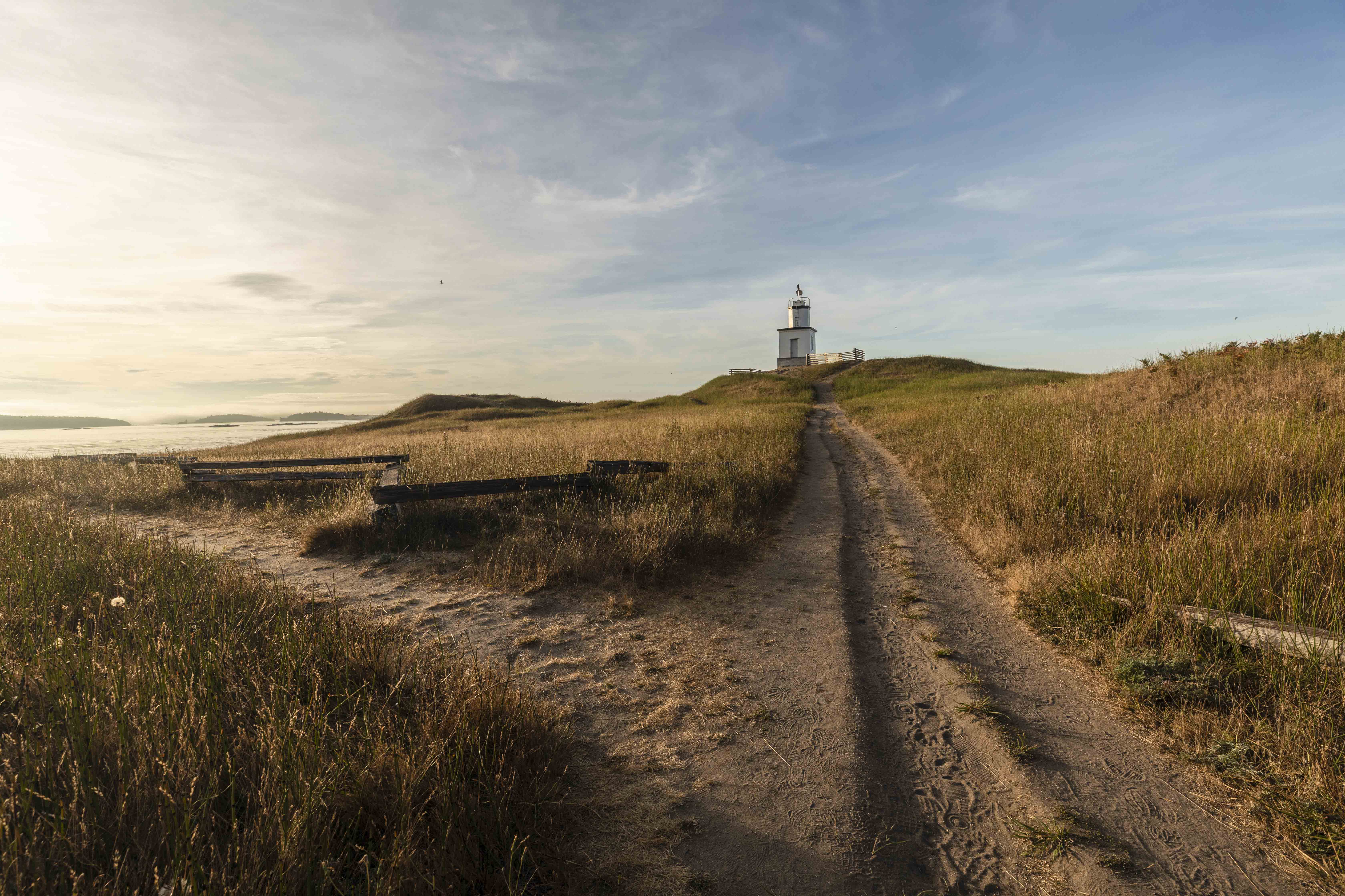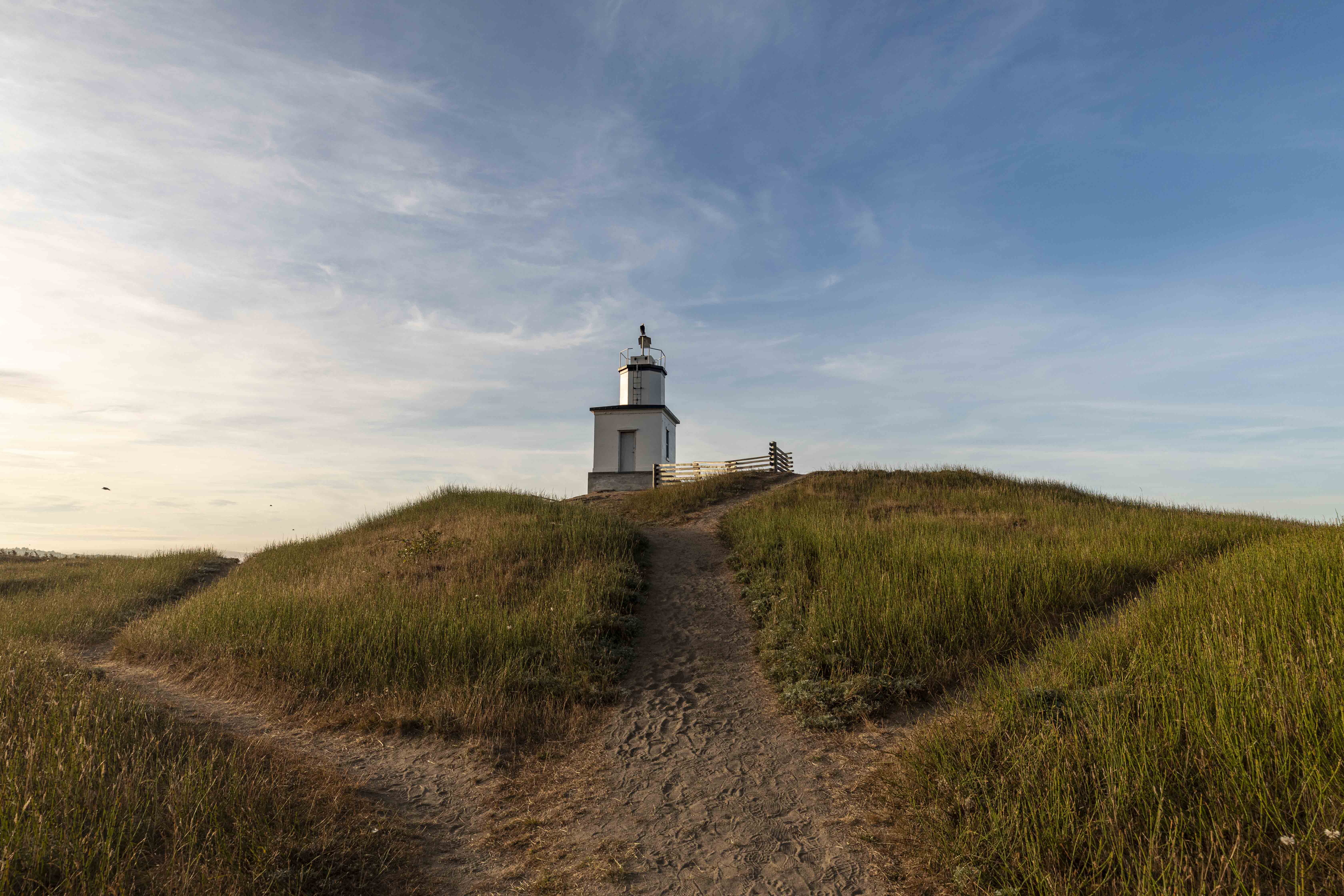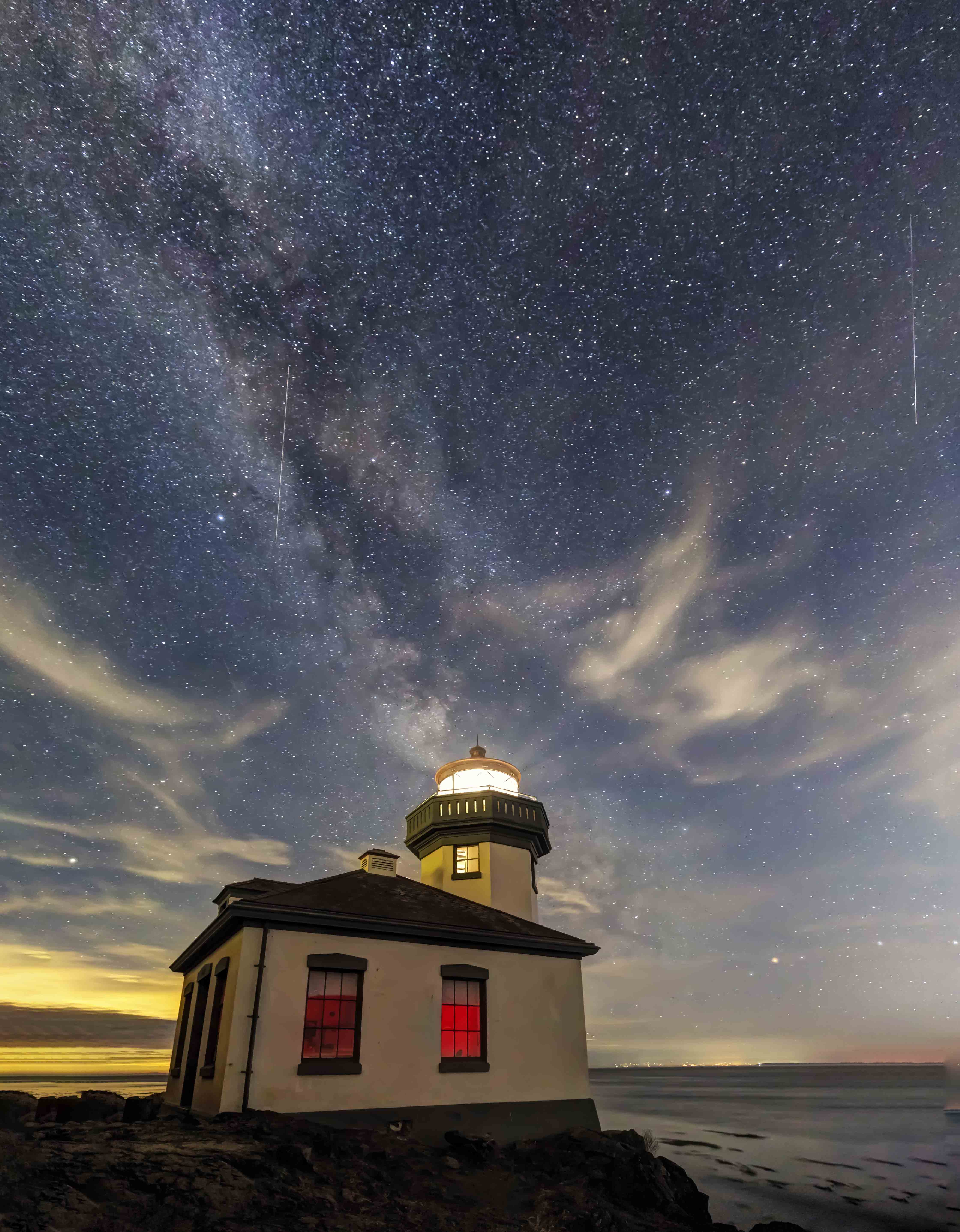 Lime Kiln Lighthouse is on the west side of the island and is famous for whale watching and sunsets. The lighthouse is surrounded by people watching the sunset. Getting the right angle to shoot from was not hard. Inside the lighthouse there is electronic equipment, the red colored LED lights glow, faintly.