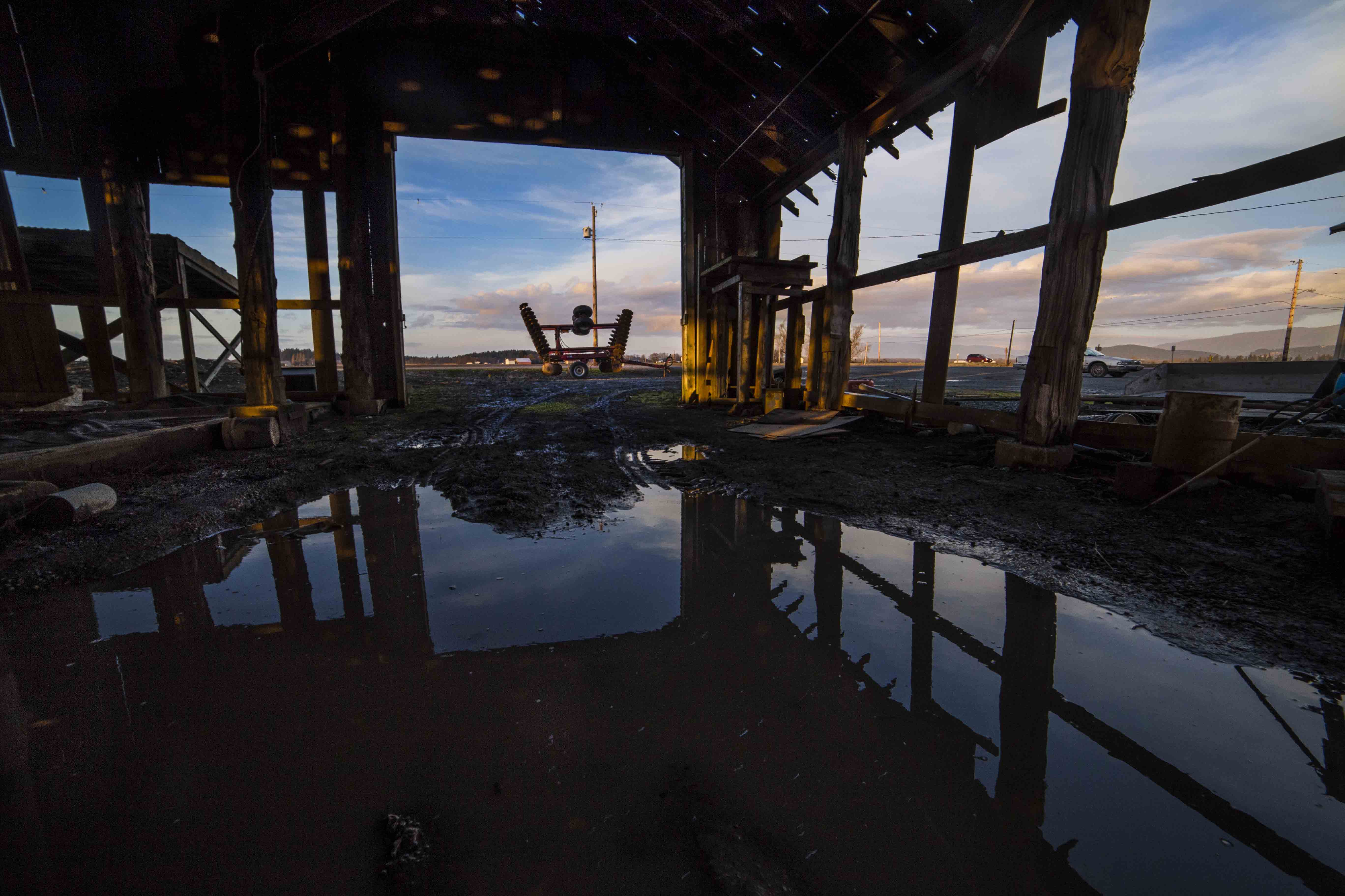 Another day of mild winter temps and beautiful afternoon skies invited me back out for another visit to Fir Island. My attention was drawn to this huge barn. All the recent rain provided plenty of mirror space.