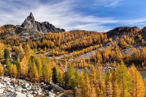 The North Cascades offer a unique version of fall, The Larch. The mountain larch, or Tamarack, looks like a regular evergreen in the spring or summer, but in early October the needles turn bright orange, and then fall off.
