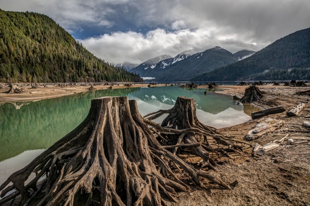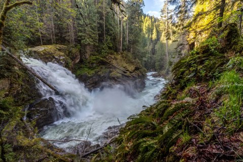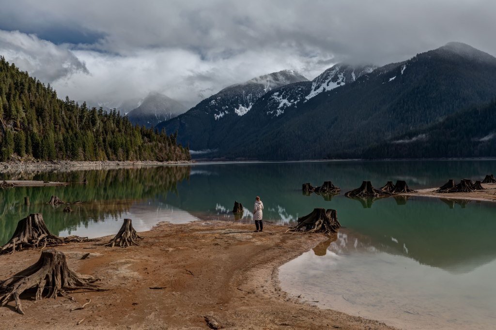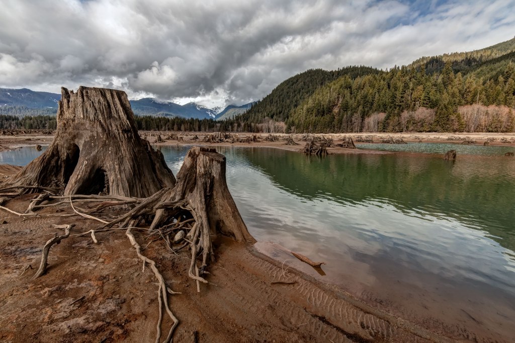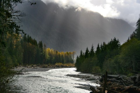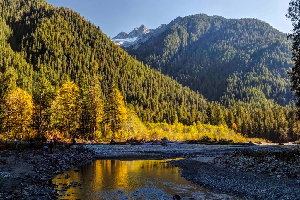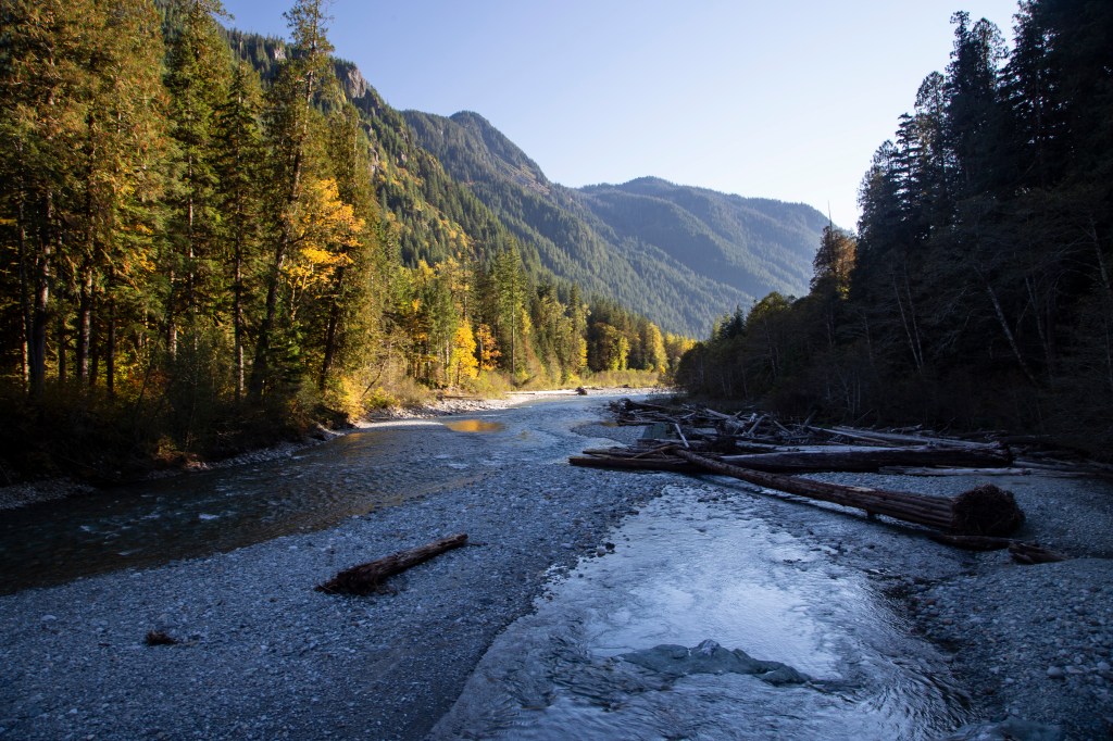 The Baker River drains the west side of the North Cascades range, merging with the Skagit River near Concrete.