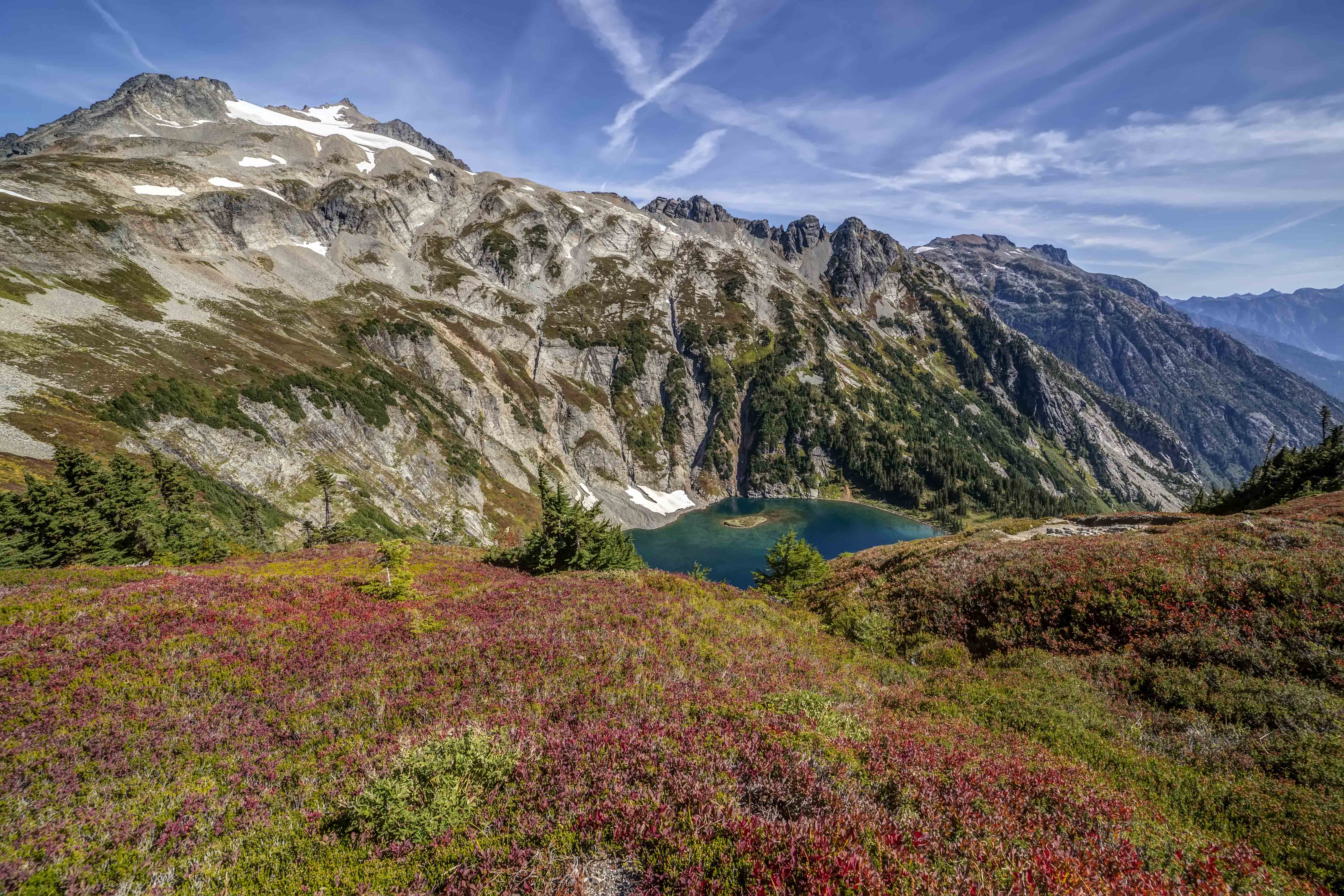 The route follows the Cascade River and ascends to Cascade Pass, then swings onto Sahale Arm, a giant curving slope carpeted in grasses and wildflowers. The overall elevation gain is 4,000 feet.