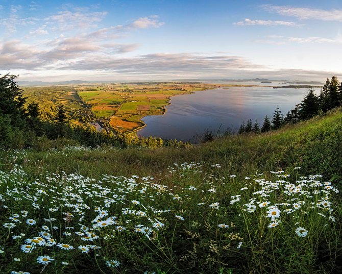 The broad expanse of sky, over the ocean and mouth of the Skagit River. There are several vista spots alone Fir Island Road, most require a Discover Pass.