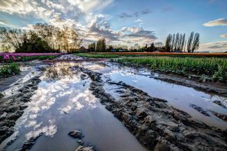 Barns, school busses, tractors, irrigation ditches, and puddles all serve well for offsetting the beauty of the flowers.