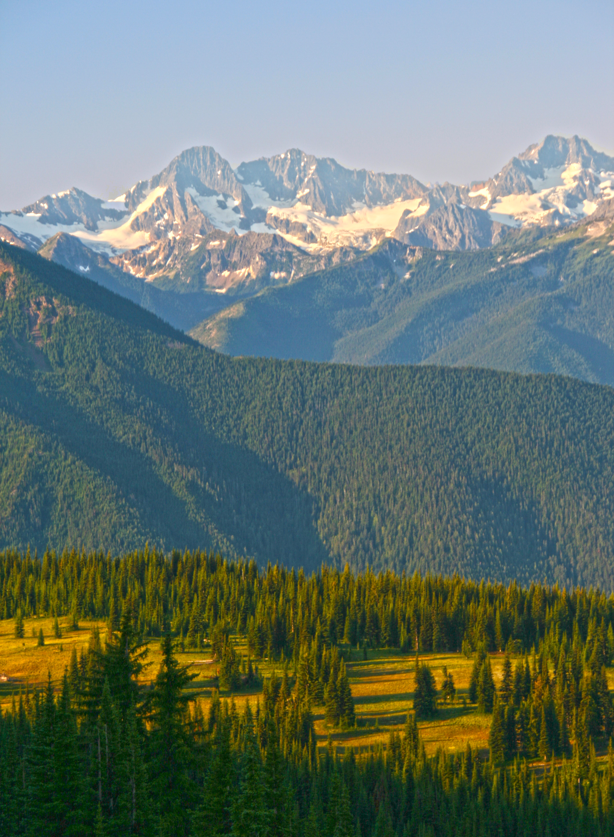 Further west, in the North Cascades National Park most hikes start at a rather low elevation, involve a longish hike through forests and then rise up to a spectacular pass.