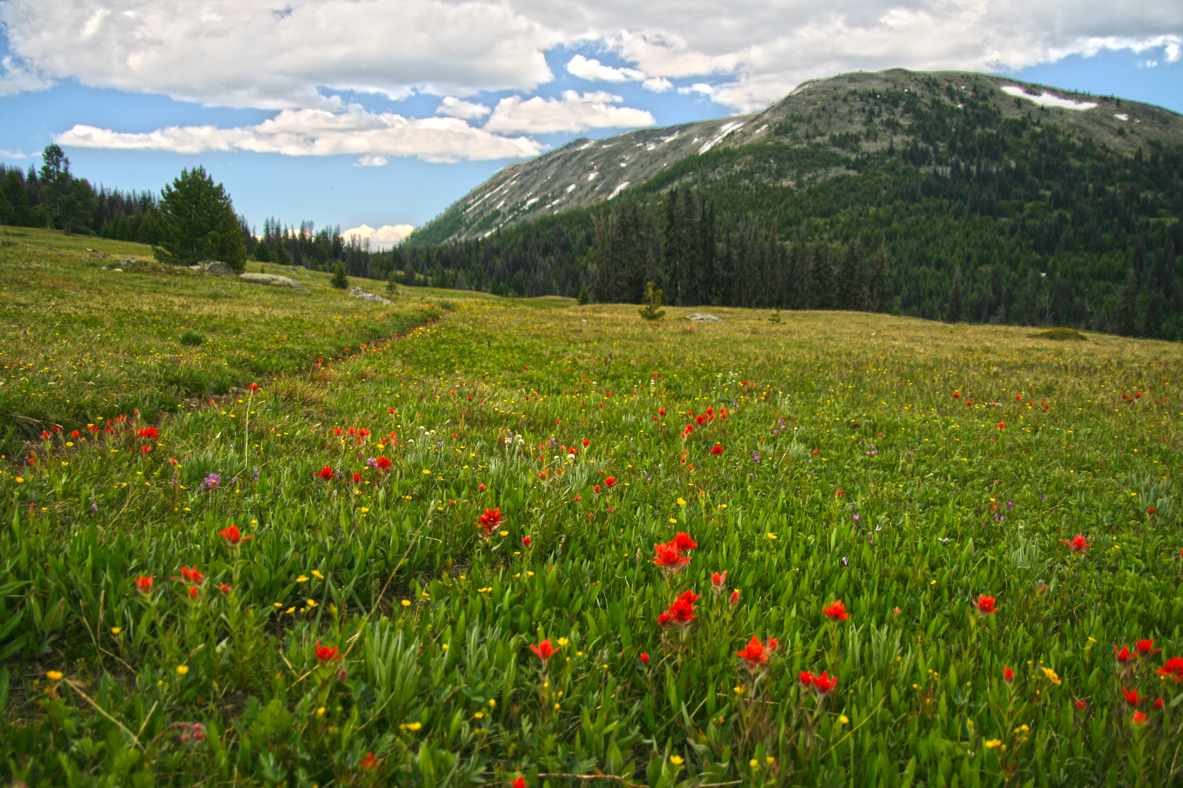 In the Pasayten the entire meadow, as far as you can see is completely filled with flowers. Columbine, paintbrush, lupines and countless others blanket the ground.