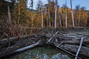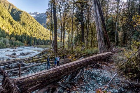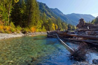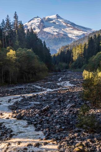 The Baker River drains the west side of the North Cascades range, merging with the Skagit River near Concrete.