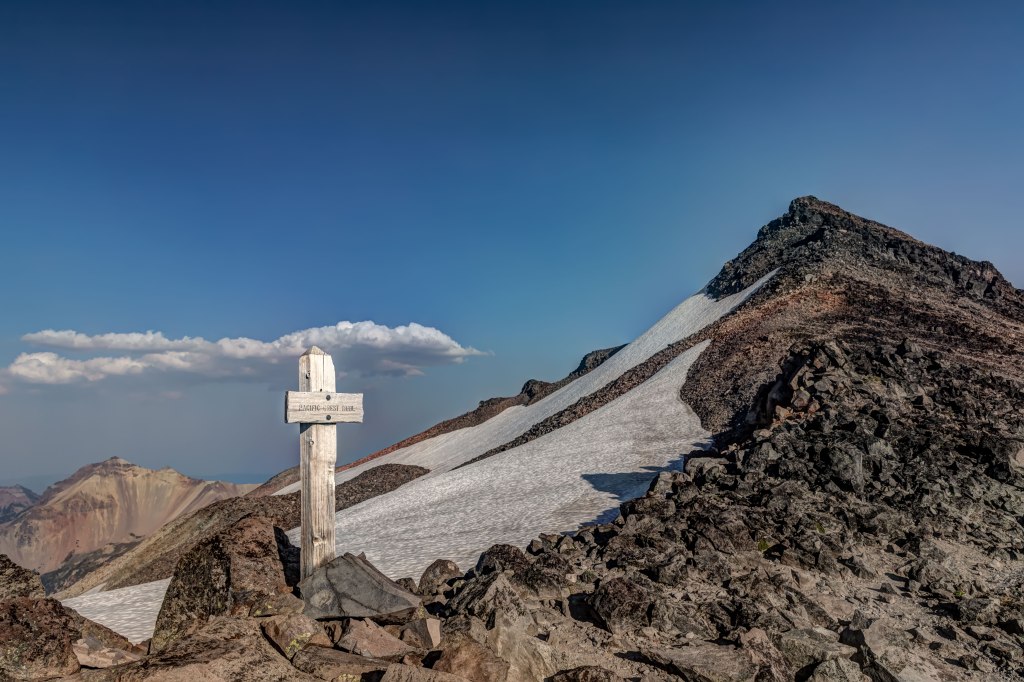 As one heads north on the PCT the trail climbs through the colorful meadows of Snow Grass Flats, through the snow and on to rock and scree to reach a promontory on the side of Old Snowy.