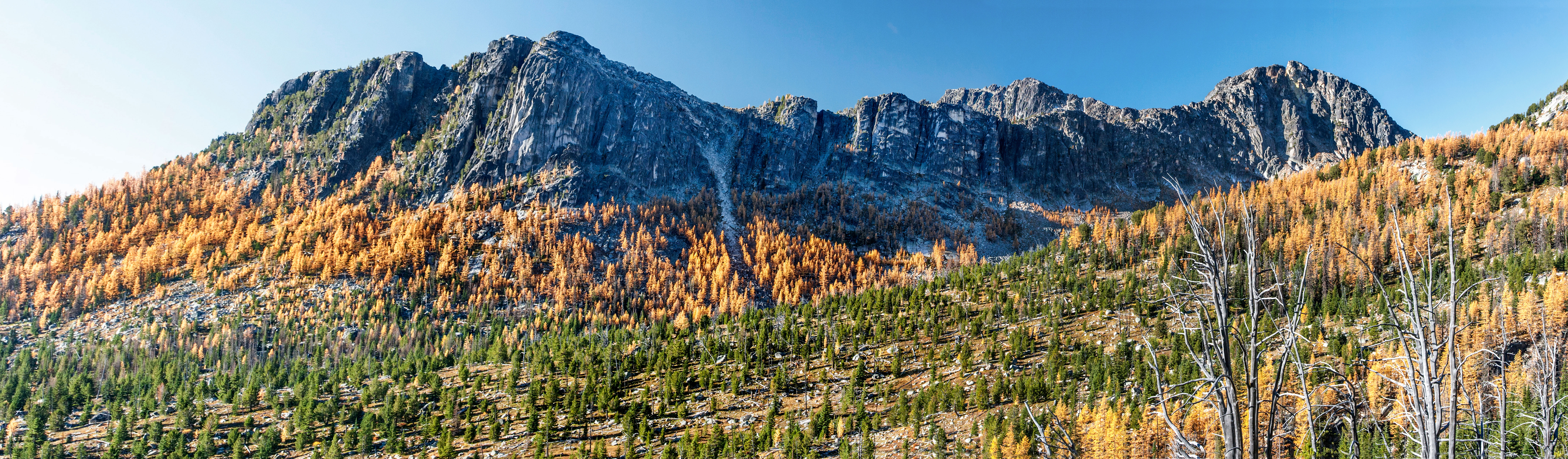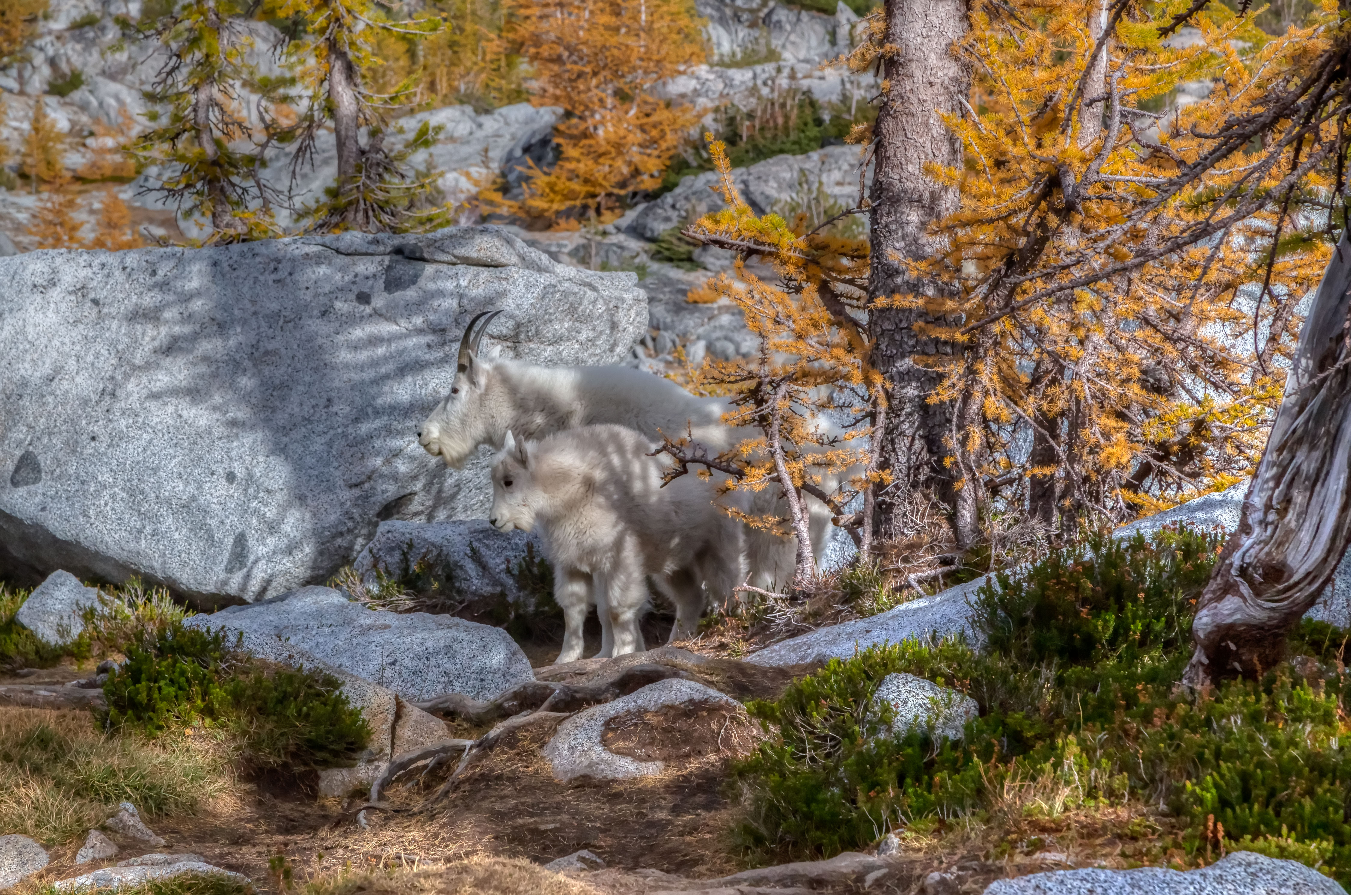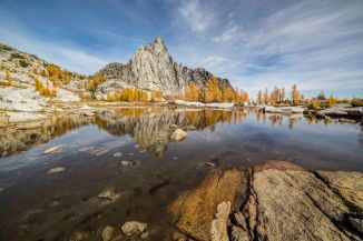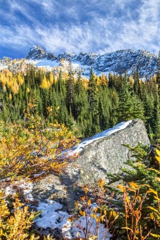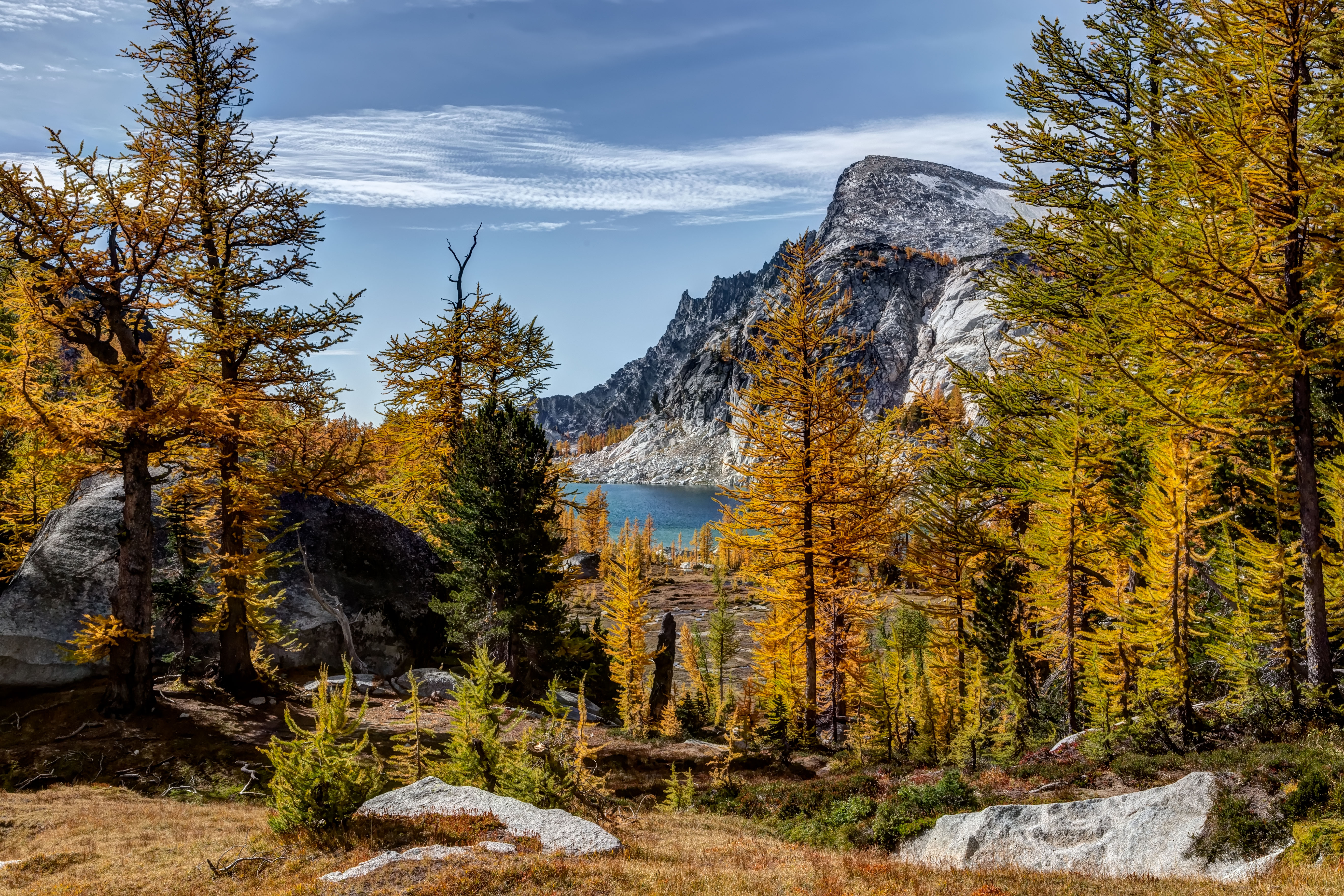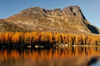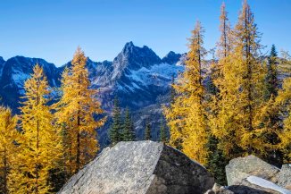Autumn brings fantastic colors. Because of the high elevation of the Enchantments Basin (between 7,000 and 8,000 feet) there are dense stands of larch. These trees have needles, and come fall they turn a bright orange color, and look like they are aglow from inside.