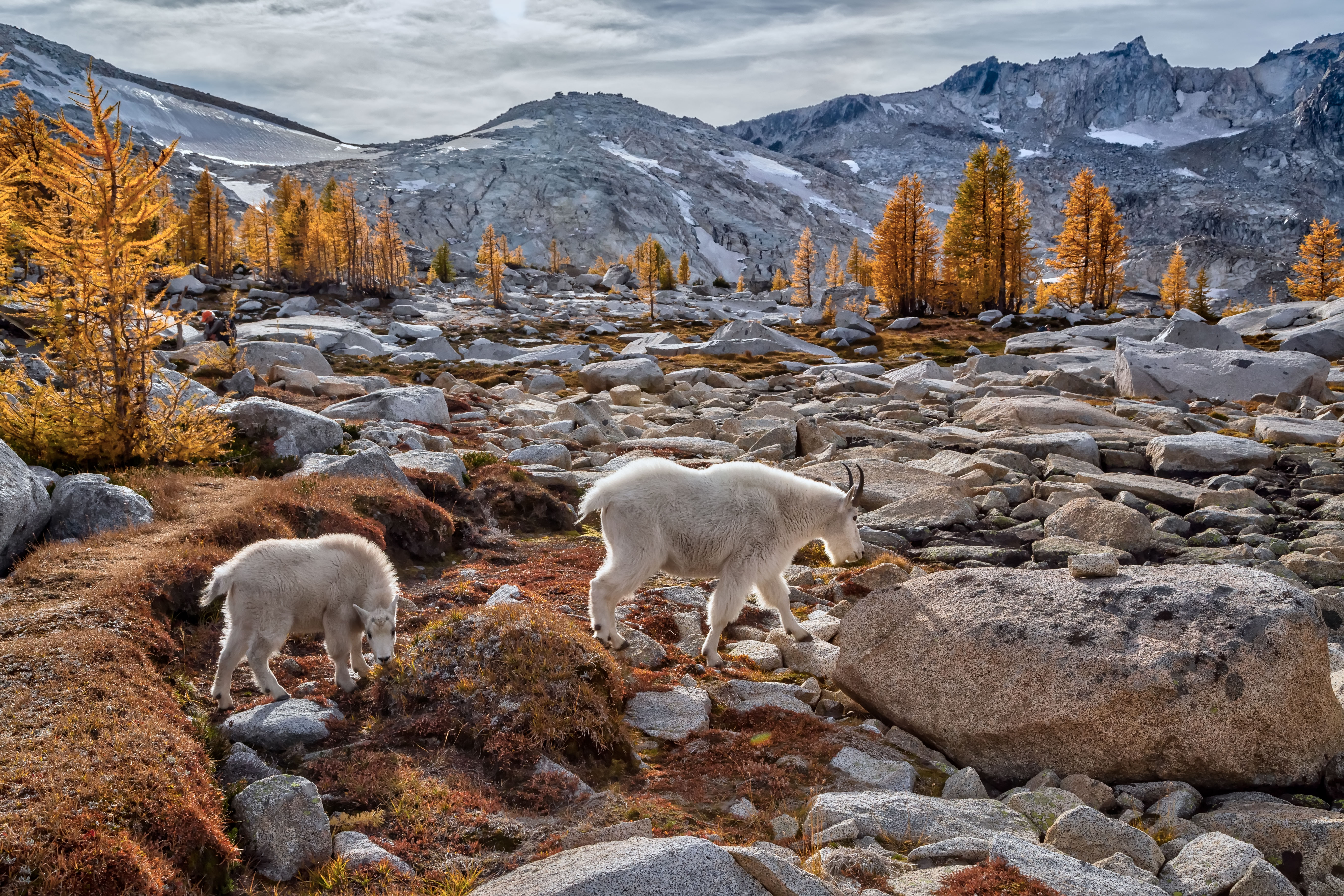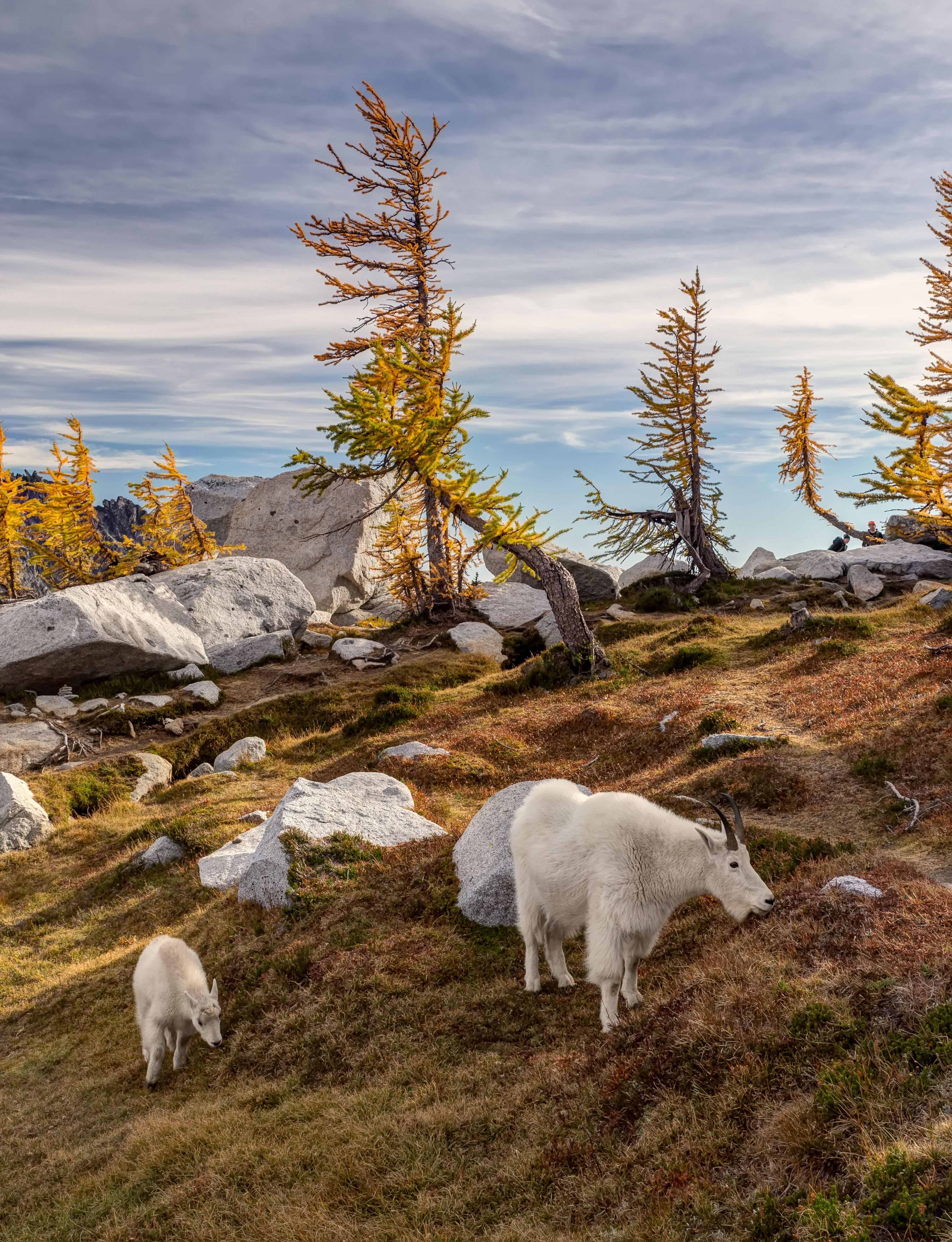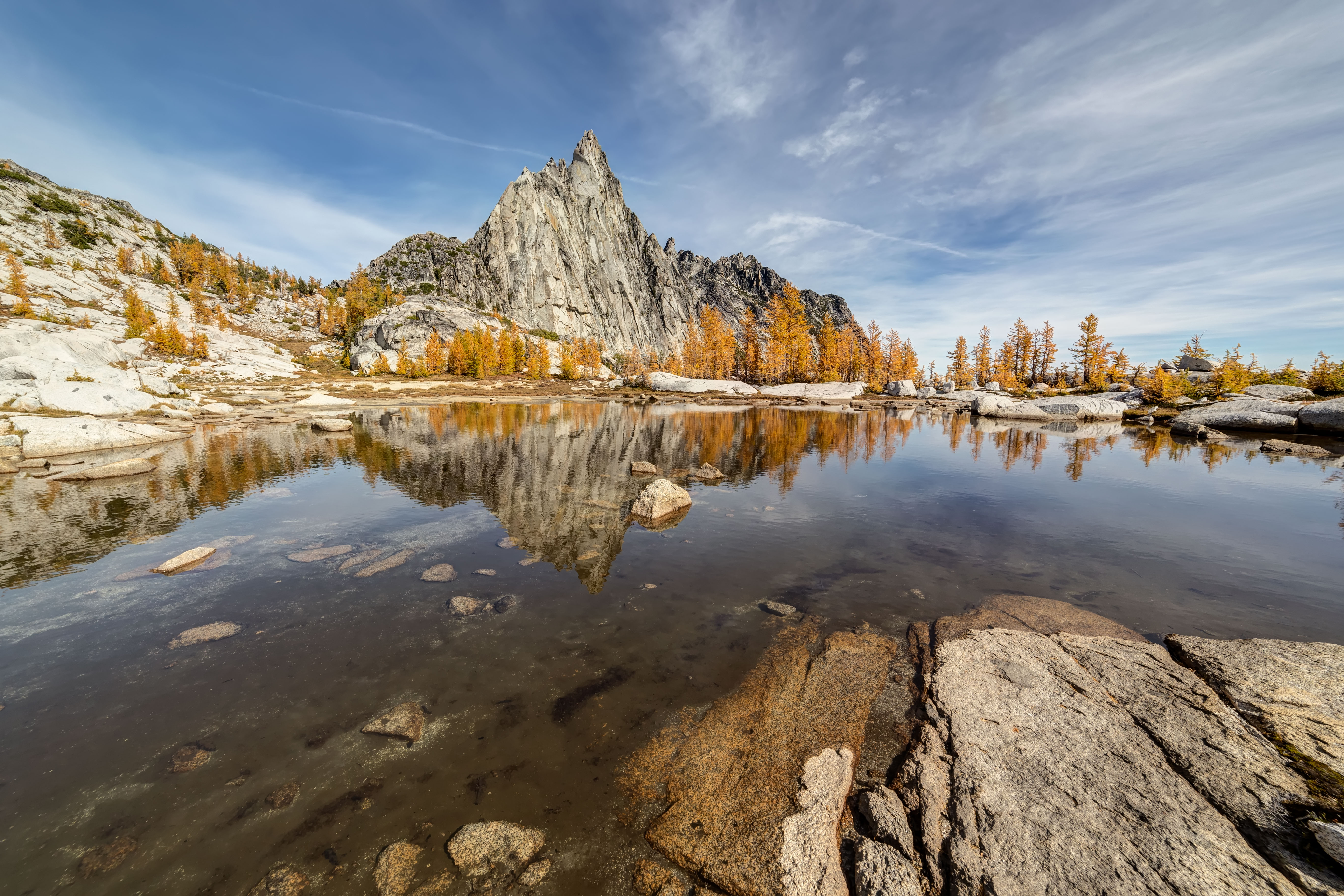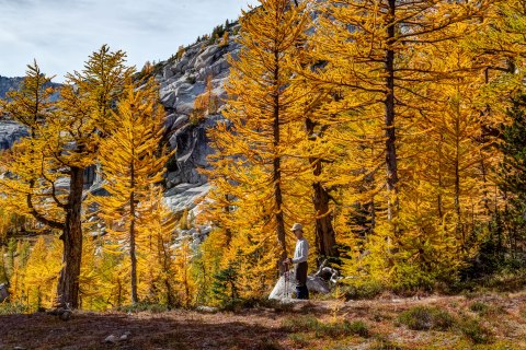 Autumn brings fantastic colors. Because of the high elevation of the Enchantments Basin (between 7,000 and 8,000 feet) there are dense stands of larch. These trees have needles, and come fall they turn a bright orange color, and look like they are aglow from inside.