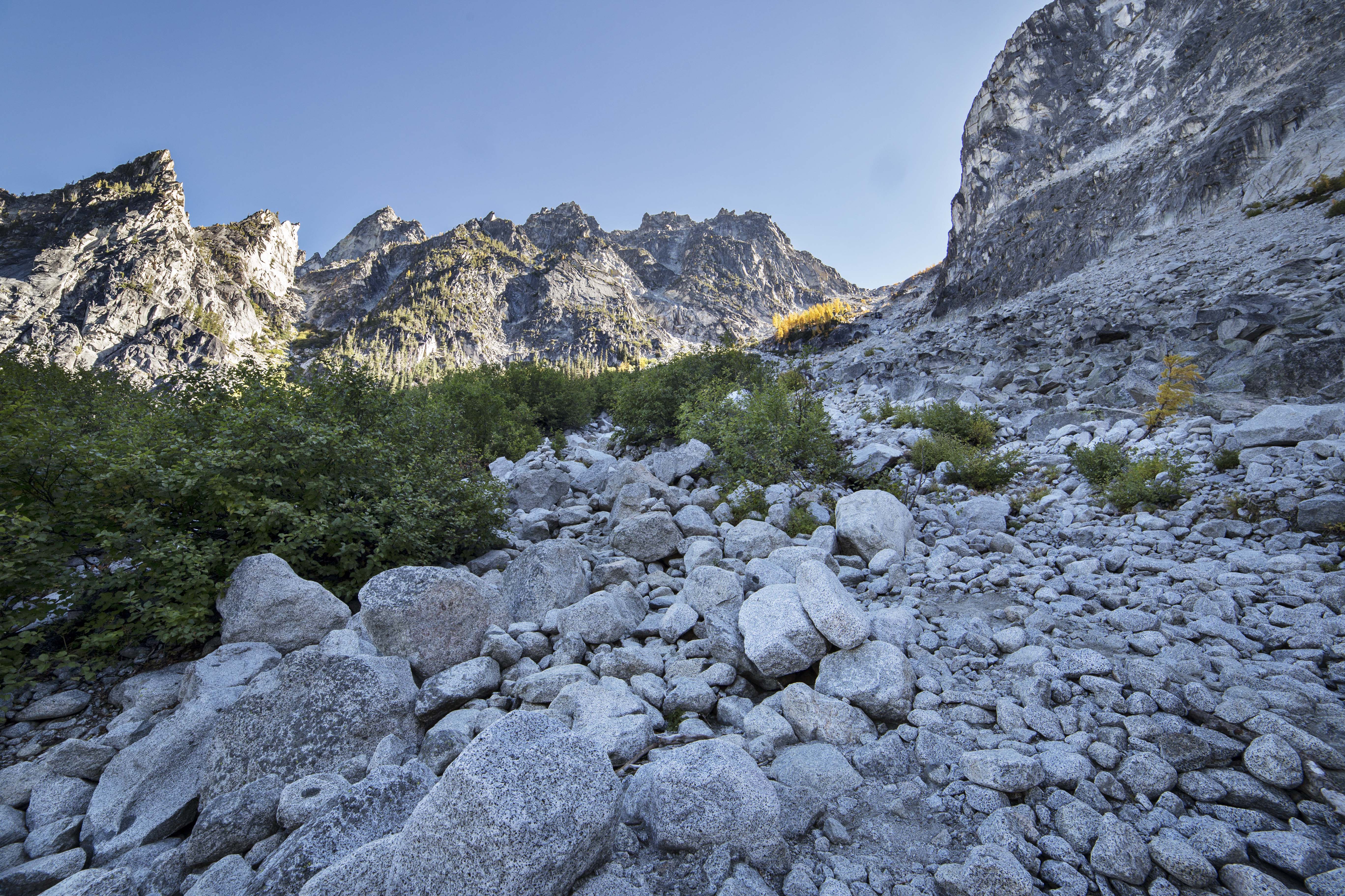 Late morning finds us clamboring over the boulder fields along the lake at the base of the trail up.