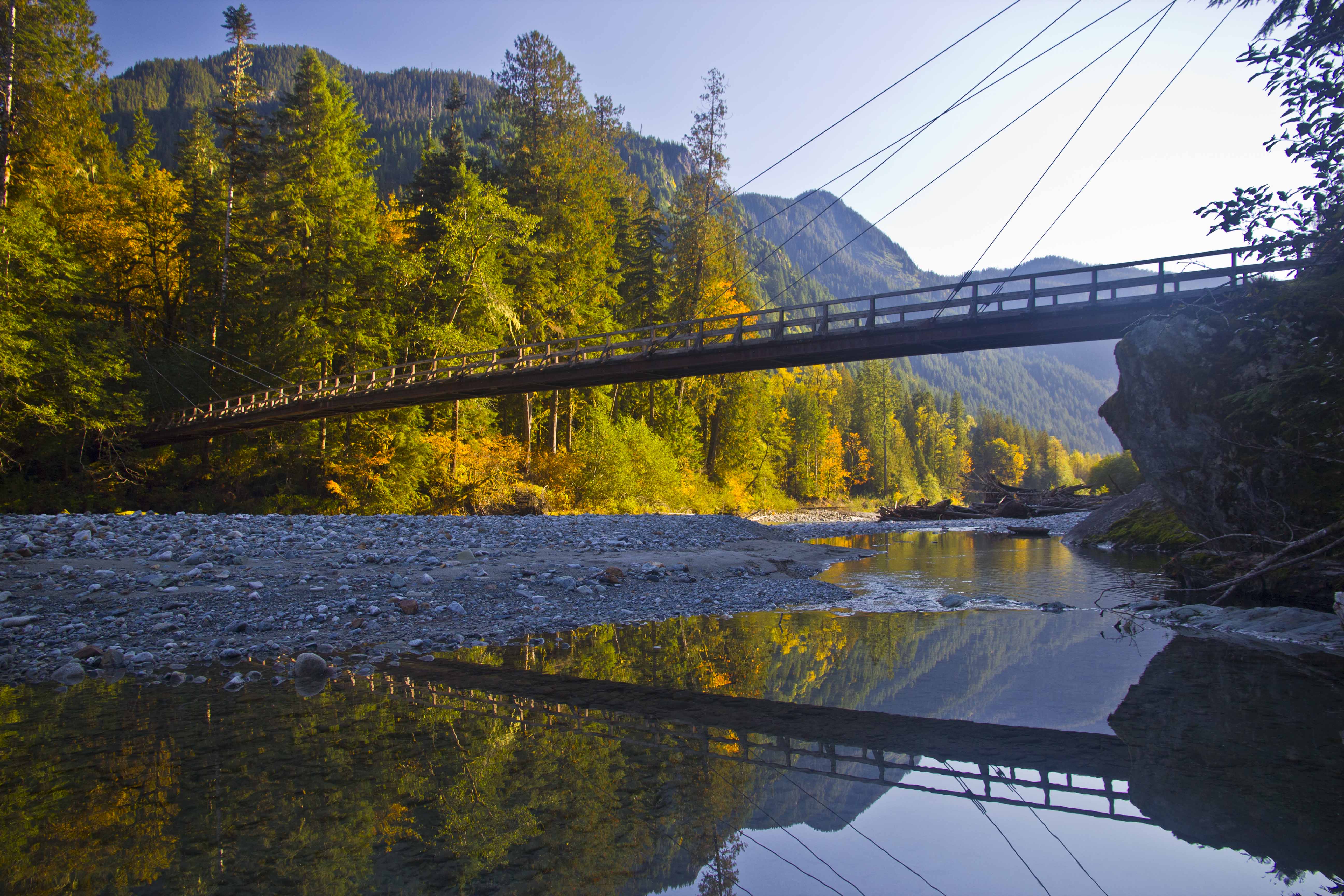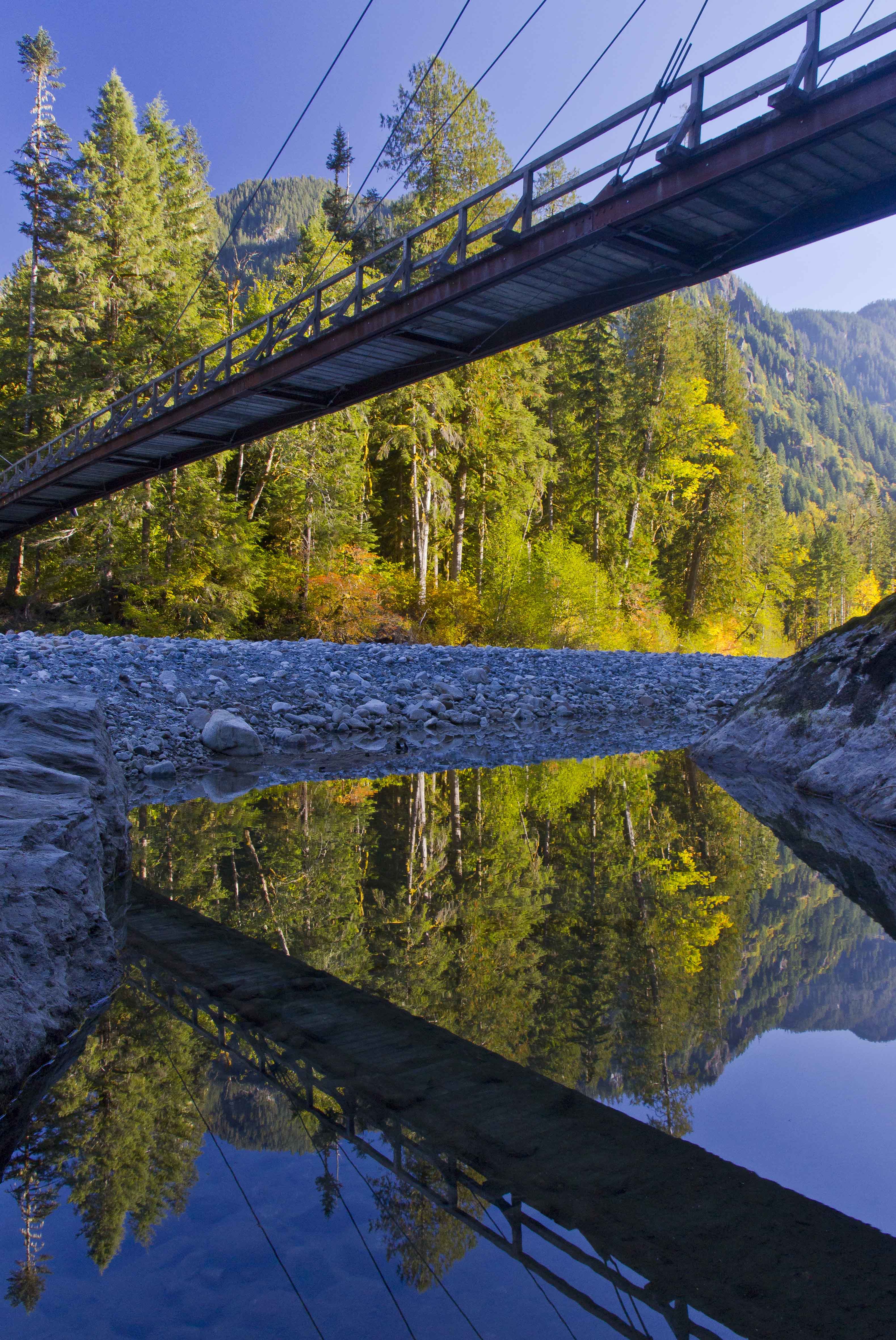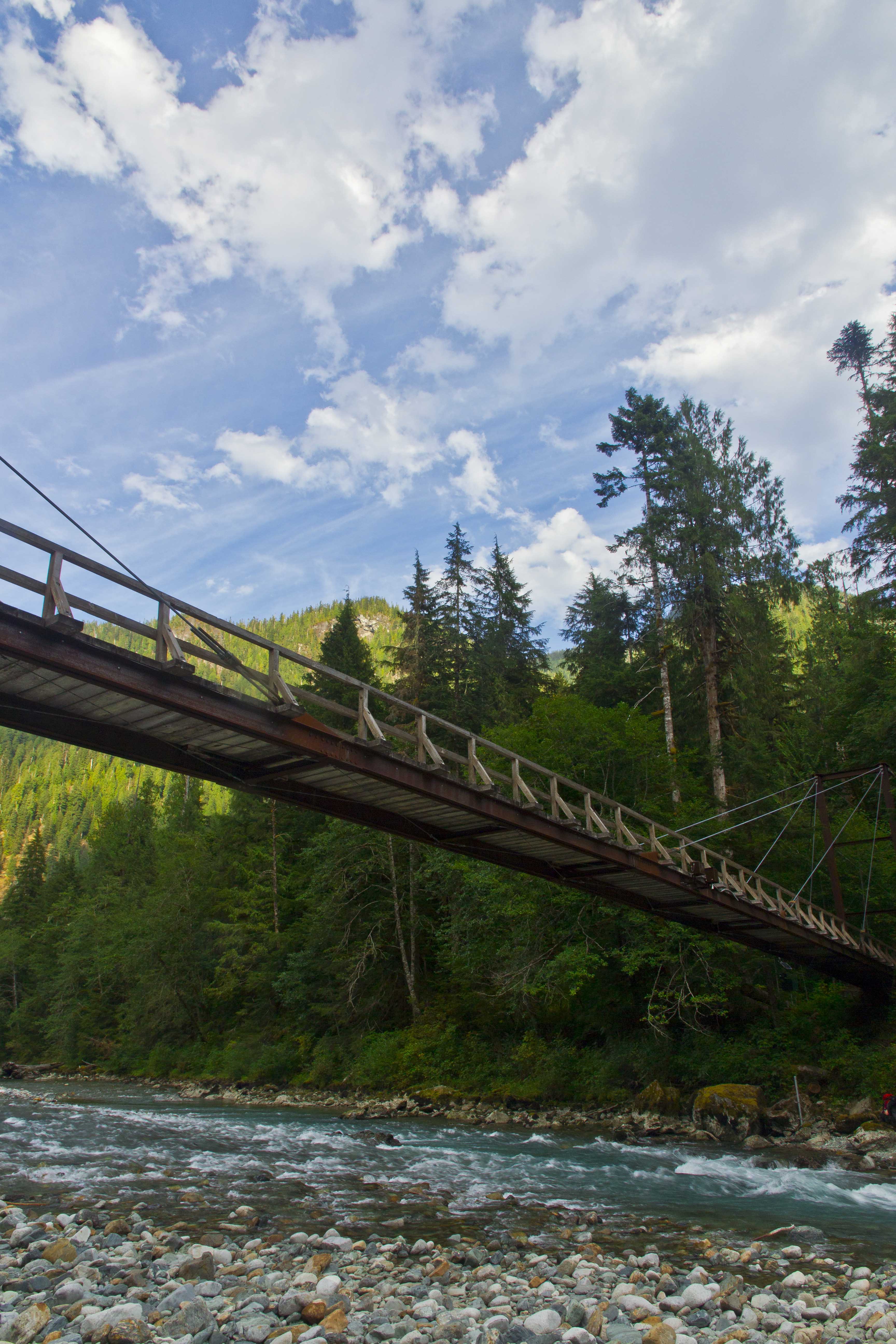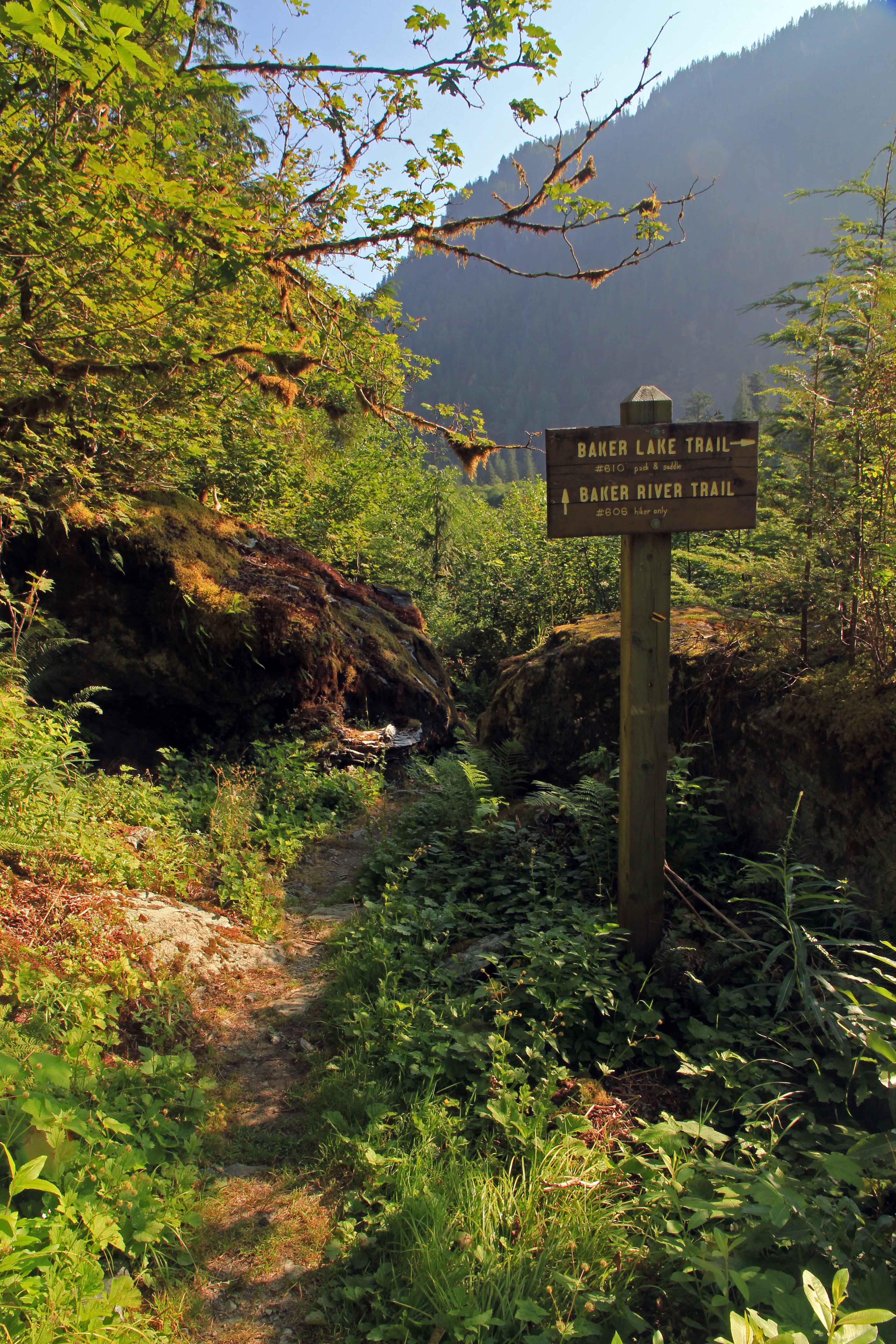 The Baker River Trail continues along the west side of the river while the east bank trail crosses the bridge heading back south along the river and along the shore of Baker Lake.