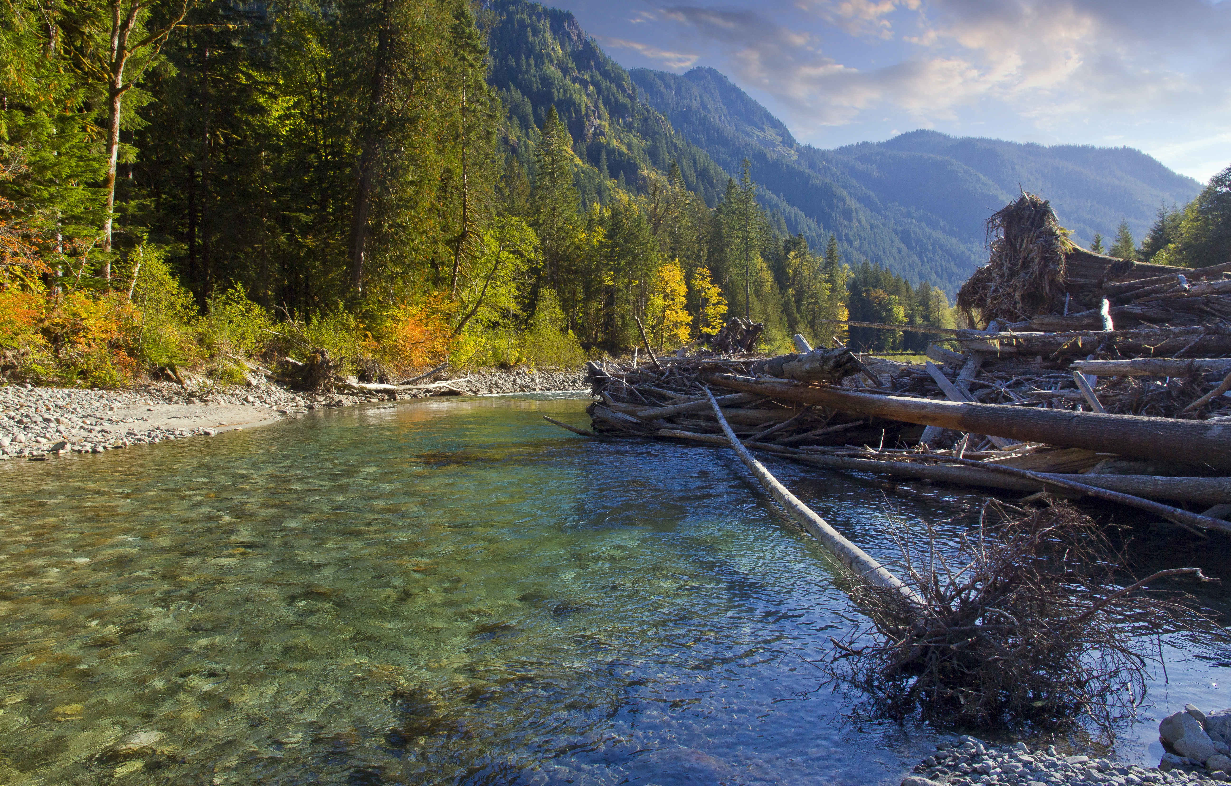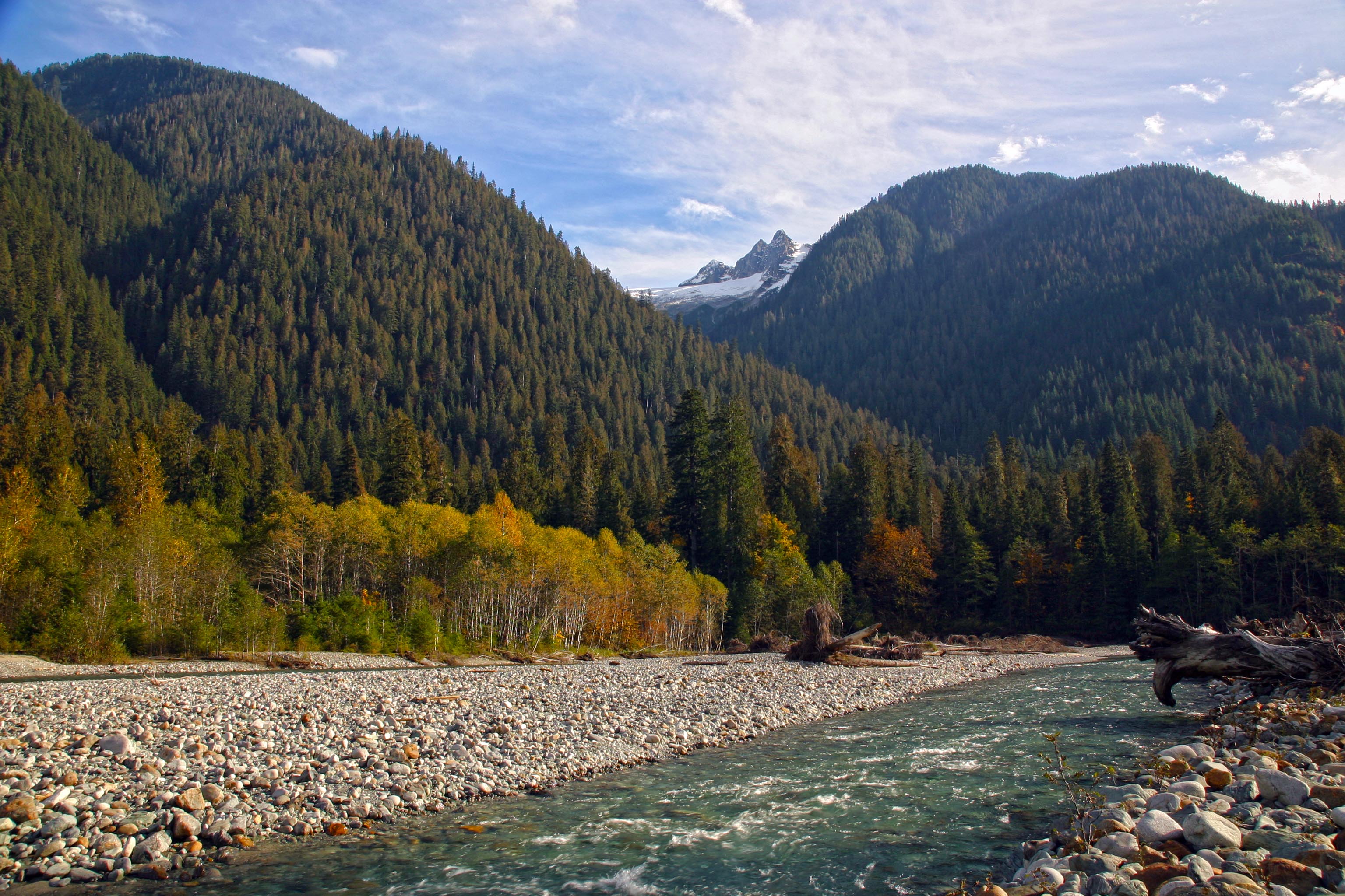 Across the river rises the jagged summit of Hagan Mountain. Looking upstream is Jagged Ridge extending from the summit of Mount Shuksan.