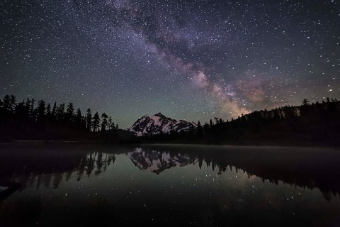 I have visited many times at night, hoping to capture the great arc of the Milky Way Galaxy above Picture Lake and Mount Shuksan. This image is from a visit in June.