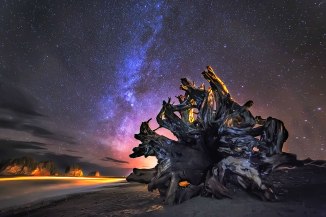 First Beach, Olympic Coast This is First Beach, in La Push, down the road from Forks. I used this huge stump to block the light pollution from the small village. This was taken in January, and the Milky Way is faint.
