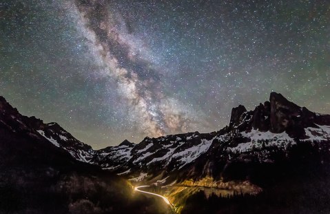 Milky Way over the North Cascades Highway at the Washington Pass Overlook. This image was taken on June 2nd, at about 1am. As the Earth rotates the Milky Way arcs across the sky. The tail lights from a car headed east, to Winthrop, provide the lighting for this pic.