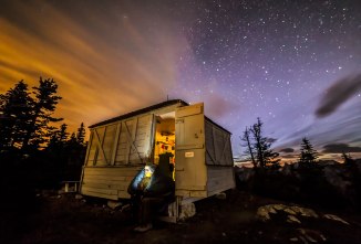 Park Butte Lookout and Mt Baker. I brought a very dim flash light and hung it from the ceiling, I could barely see it from out side, and it provided plenty of light for me. It looks like the stars emanate from the crater on Mt Baker!