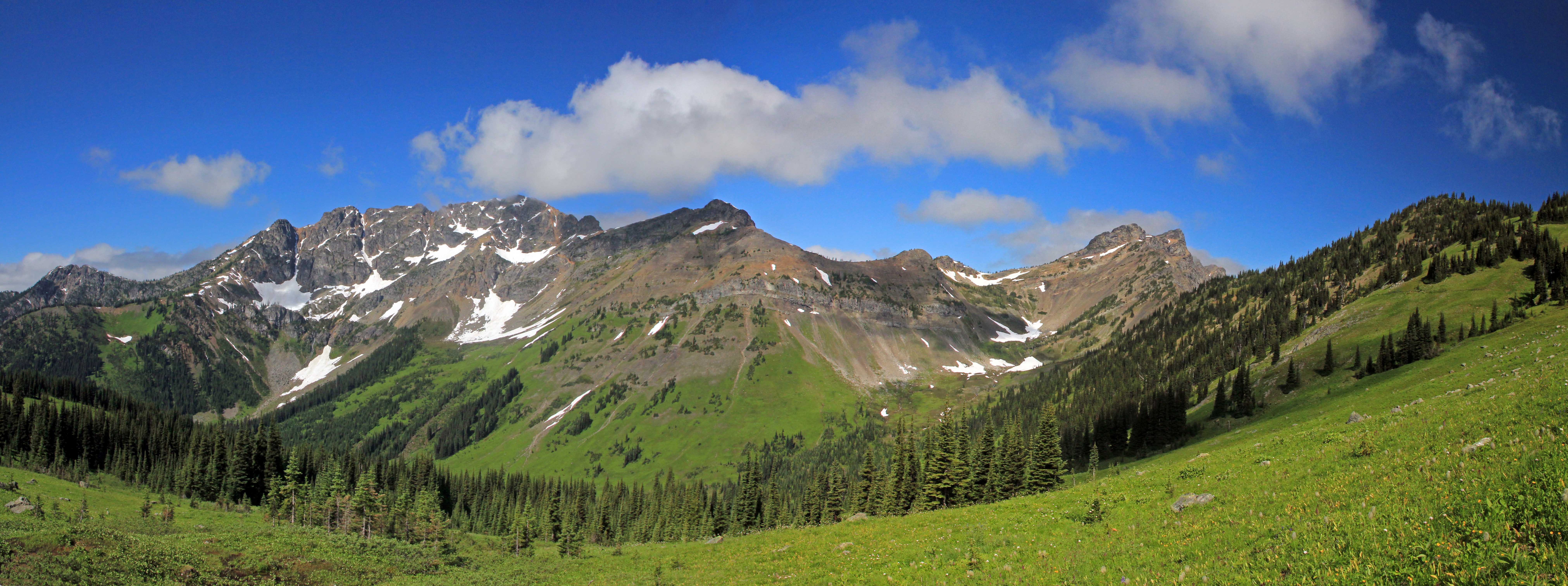 From Rock Pass the trail makes a slight dip, traversing a steep gully, before rising to Woody Pass. Here the trail crosses the Cascade Crest and views appear west to Mount Baker and the Picket Range.
