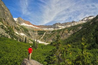 The route follows the Cascade River and ascends to Cascade Pass, then swings onto Sahale Arm, a giant curving slope carpeted in grasses and wildflowers. The overall elevation gain is 4,000 feet.