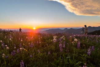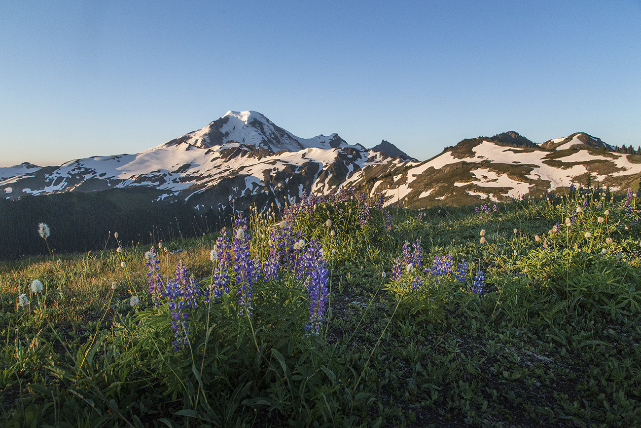 Skyline Divide is a trail reached from Highway 542. This trail leads up and onto a ridge carpeted with lupine, paintbrush and other flowers with grandstand views of Mount Baker, adorned with glaciers.