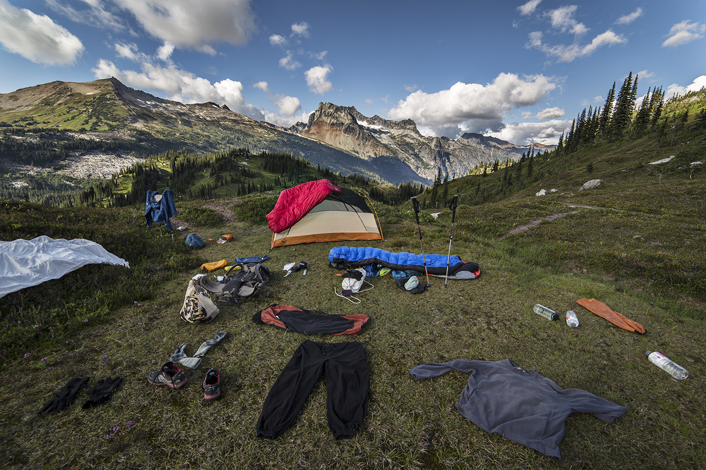 We hiked the first day about 5 miles to Spider Meadows. There were many people camped here (it was on a Saturday) but not hard to find a wonderful camp in the endless green meadows. The sky was filled with wonderful clouds…